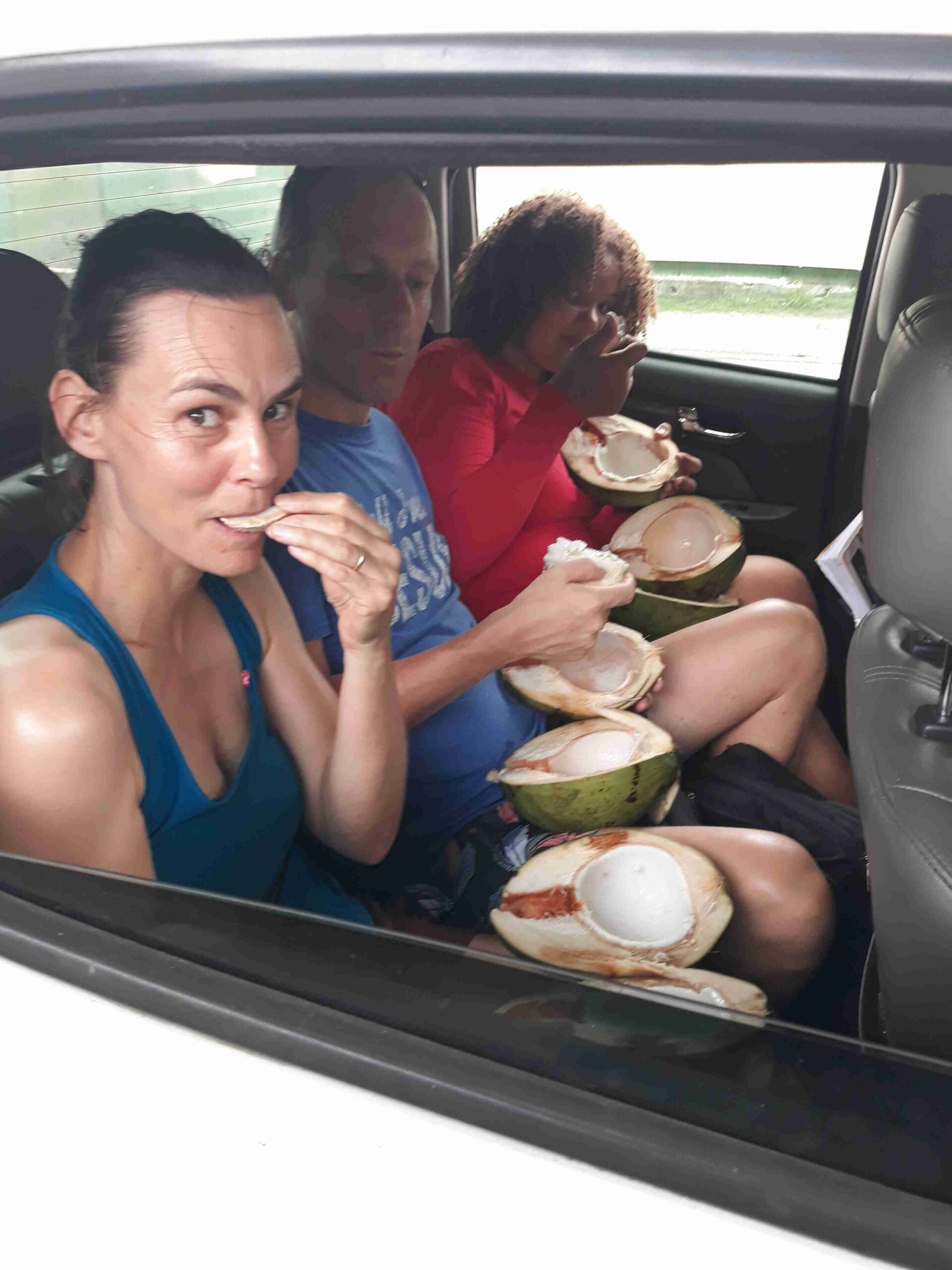 - Op de achterbank genieten van een verse kokosnoot