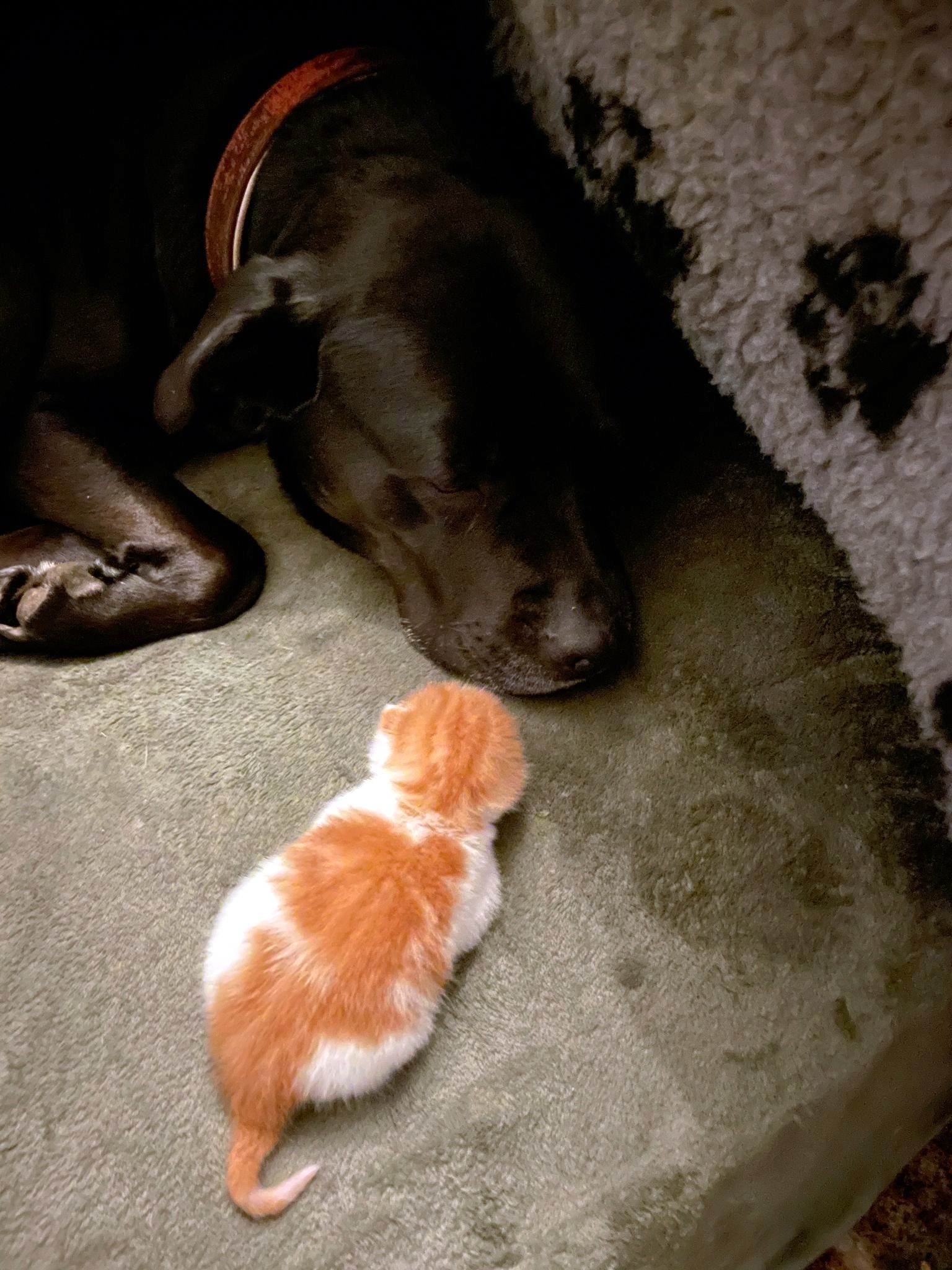 Er lopen hier verschillende poezen rond het huis. En één van de poezen had een kitten gekregen. Kort na deze gezinsuitbreiding viel het John, de eigenaar op dat hij de poes even niet had gezien. En de volgende dag vond hij de jonge kitten eenzaam en hard mauwend in de schuur. Hij vreesde het ergste en ging in de buurt op zoek naar de moederpoes. Helaas vond hij haar levenloos in de berm. Gauw kocht hij melkpoeder om de luide en hongerige kitten te kunnen voeden.