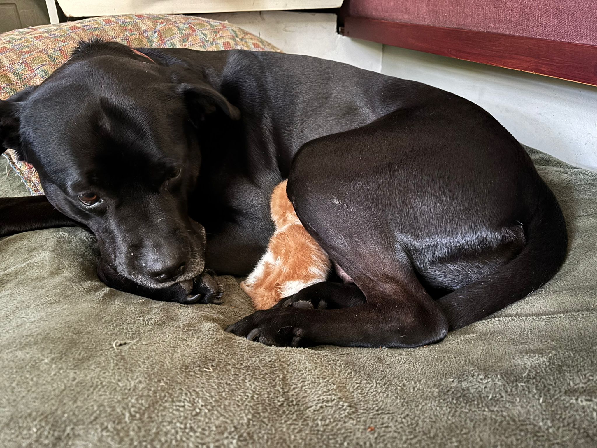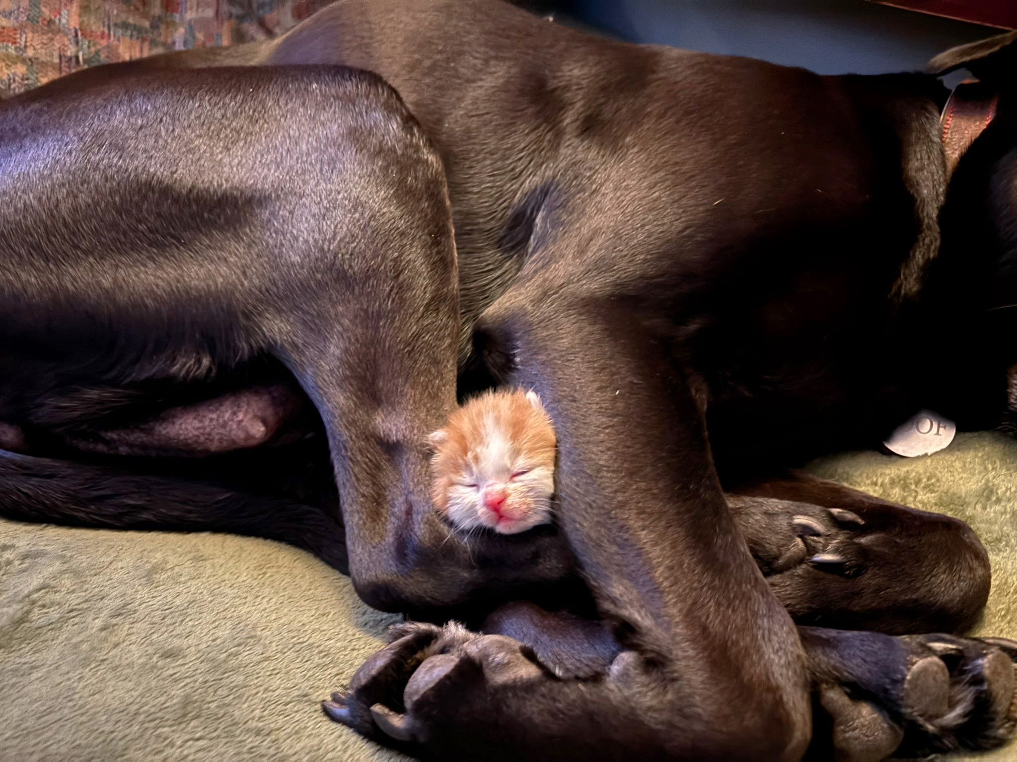 Dit alles ging uiteraard niet onopgemerkt voorbij aan de 2 grote honden, Sien en Soof. Het gevolg was dat de moedergevoelens van Soof werden aangewakkerd en ze de jammerende kitten onder haar hoede nam, het begon te likken en te verzorgen. En ja, zelfs na een paar dagen ging ze melk produceren voor haar geadopteerde telg. Hoe bijzonder heeft God het toch gemaakt!