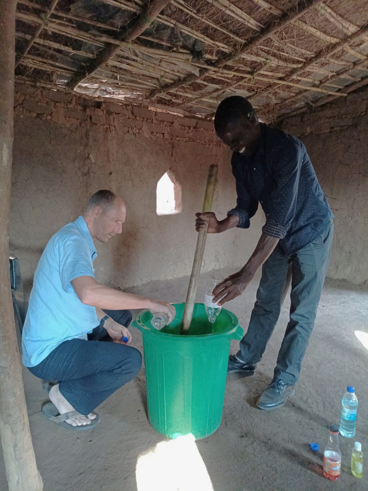 Ook Arjan is in zijn sas en kan één van zijn talenten inzetten. De week voor de conferentie legde Byson ons zijn probleem voor. Hij heeft geen baan, maar hij heeft geleerd hoe hij verschillende soorten vloeibare zeep kan maken, zoals afwasmiddel, vloerreiniger, wc reiniger enz. Er is genoeg vraag naar deze producten, maar telkens liep het toch vast.