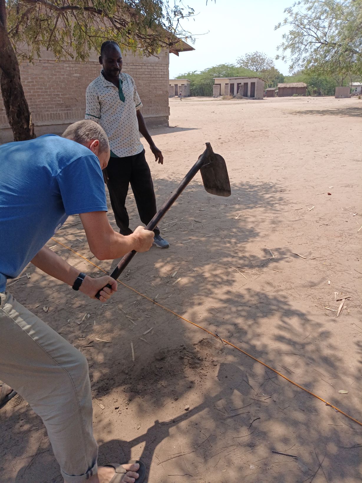 De mannen raken enthousiast en onder de indruk van de nieuwe eenvoudige manier. En met z’n allen gaan we naar buiten en gewapend met een zelfgemaakte meetsnoer en Afrikaanse schop gaan we droog oefenen. Er wordt erg gelachen als Arjan, de azungu voor het eerst gaten in de harde grond slaat met het voor hem vreemde gereedschap. Iedereen doet mee. De één haalt as en doet het in het gat, de ander gooit er zogenaamde mest in, een ander dekt het toe en ‘plant’ de 3 maiszaadjes, En een ander zoekt bladeren voor de bedekking. We hebben lol.