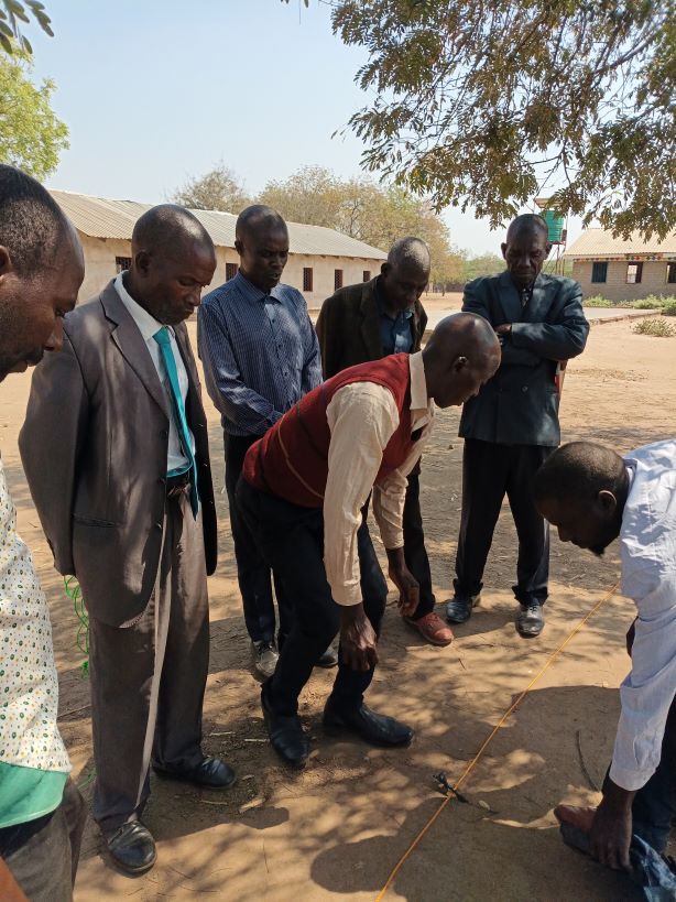 De mannen raken enthousiast en onder de indruk van de nieuwe eenvoudige manier. En met z’n allen gaan we naar buiten en gewapend met een zelfgemaakte meetsnoer en Afrikaanse schop gaan we droog oefenen. Er wordt erg gelachen als Arjan, de azungu voor het eerst gaten in de harde grond slaat met het voor hem vreemde gereedschap. Iedereen doet mee. De één haalt as en doet het in het gat, de ander gooit er zogenaamde mest in, een ander dekt het toe en ‘plant’ de 3 maiszaadjes, En een ander zoekt bladeren voor de bedekking. We hebben lol.