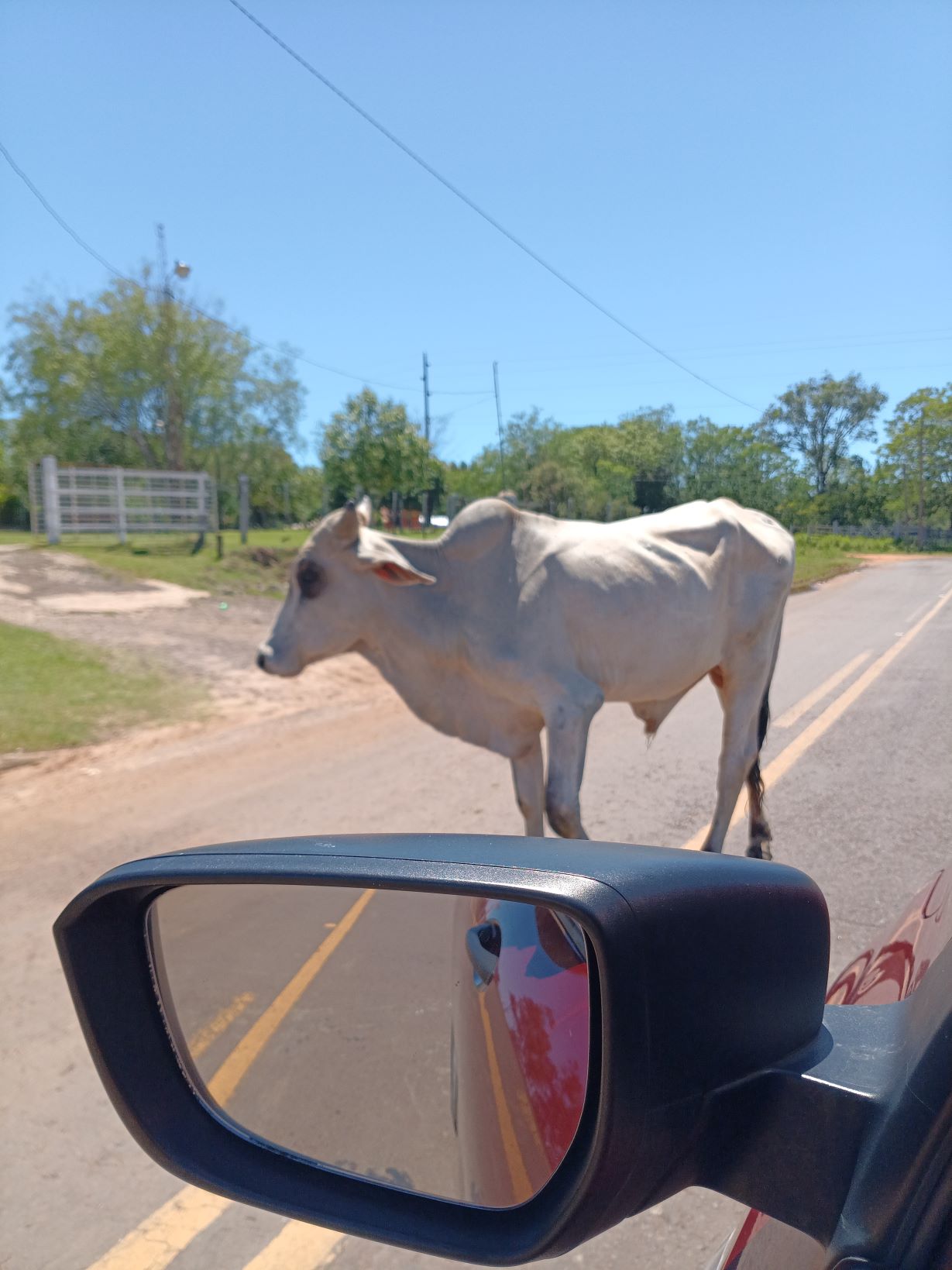 Onze reis ging verder door het zuiden van Paraguay. Het is echt genieten, rijdend door het weidse groene landschap met rood gekleurde aarde. Geregeld staan er koeien aan een touw in de berm te grazen. Maar soms zijn ze ook losgebroken en willen ze het gras aan de andere kant van de weg eens testen. Dus naast de vele straathonden, hobbels en wat gaten in het asfalt, is het ook oppassen voor deze dieren.