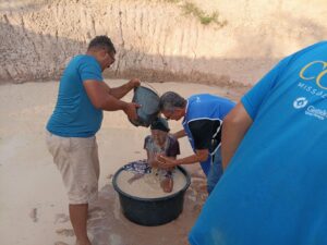 Eén doop was wel bijzonder. We kwamen bij het huisje van Maria, een oudere vrouw die op sterven had gelegen toen Antonio haar eens had bezocht. Door gebed was ze genezen en had ze haar leven aan Jezus gegeven. Nu vertelden we haar over de doop. Ze wilde gedoopt worden, maar er was te weinig water in de ton bij haar huis vanwege droogte. Ze zei dat ze graag helemaal onder wilde zoals een begrafenis. We vonden in de buurt een troebele waterpoel, maar de poel bleek toch te ondiep. Dus ging ze daar in de ton met water zitten en werd er flink water over haar uitgegoten. Omdat het water zo wit was, noemden we het ‘de eerste doop in melk’. Maria was heel blij en voelde zich helemaal nieuw.