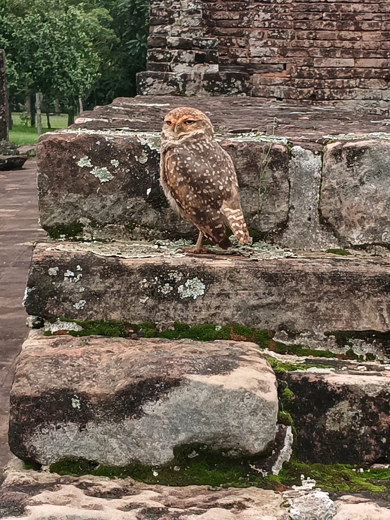 Maar wat typisch Paraguayaans is, we hadden de ruïnes helemaal voor onszelf en dat in december, de vakantie maand. Er was geen enkele andere toerist te bekennen. Behalve dat we onverwacht oog in oog stonden met de enige inwoners van de nederzetting, jonge uiltjes.
