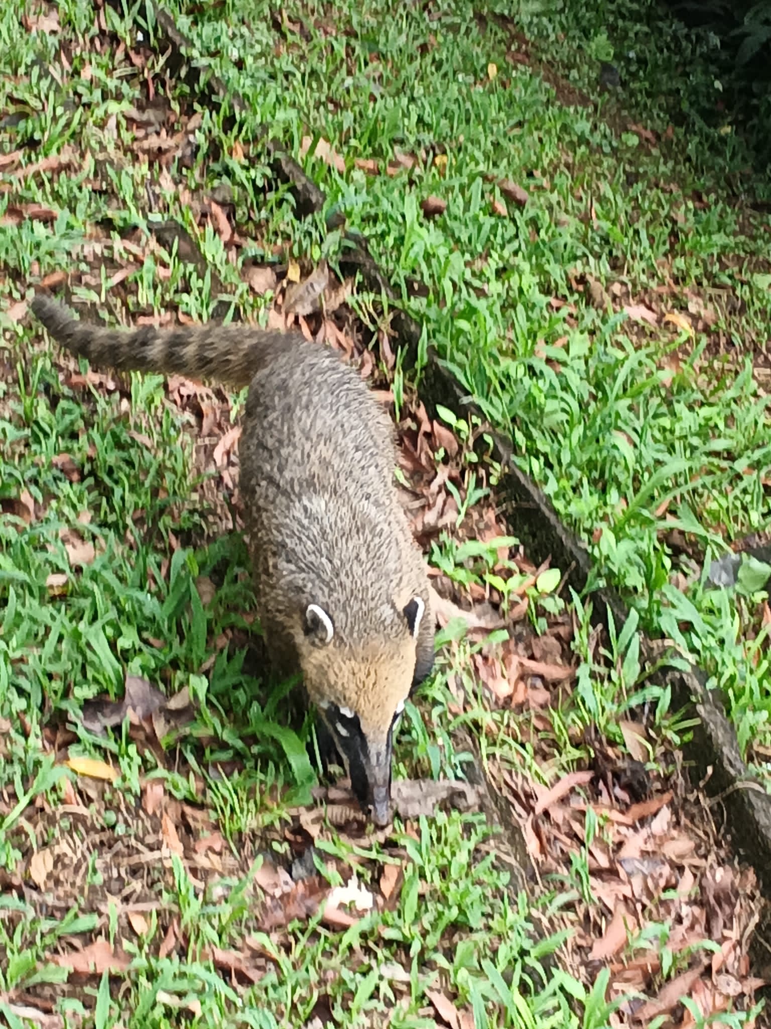 Tijdens de wandeling liepen er ook een aantal nieuwsgierige coati’s langs het pad. Dit zijn wasbeer-achtige dieren met een lange snuit en staart. Ze lieten zich even zien voordat ze weer in de begroeiing verdwenen.