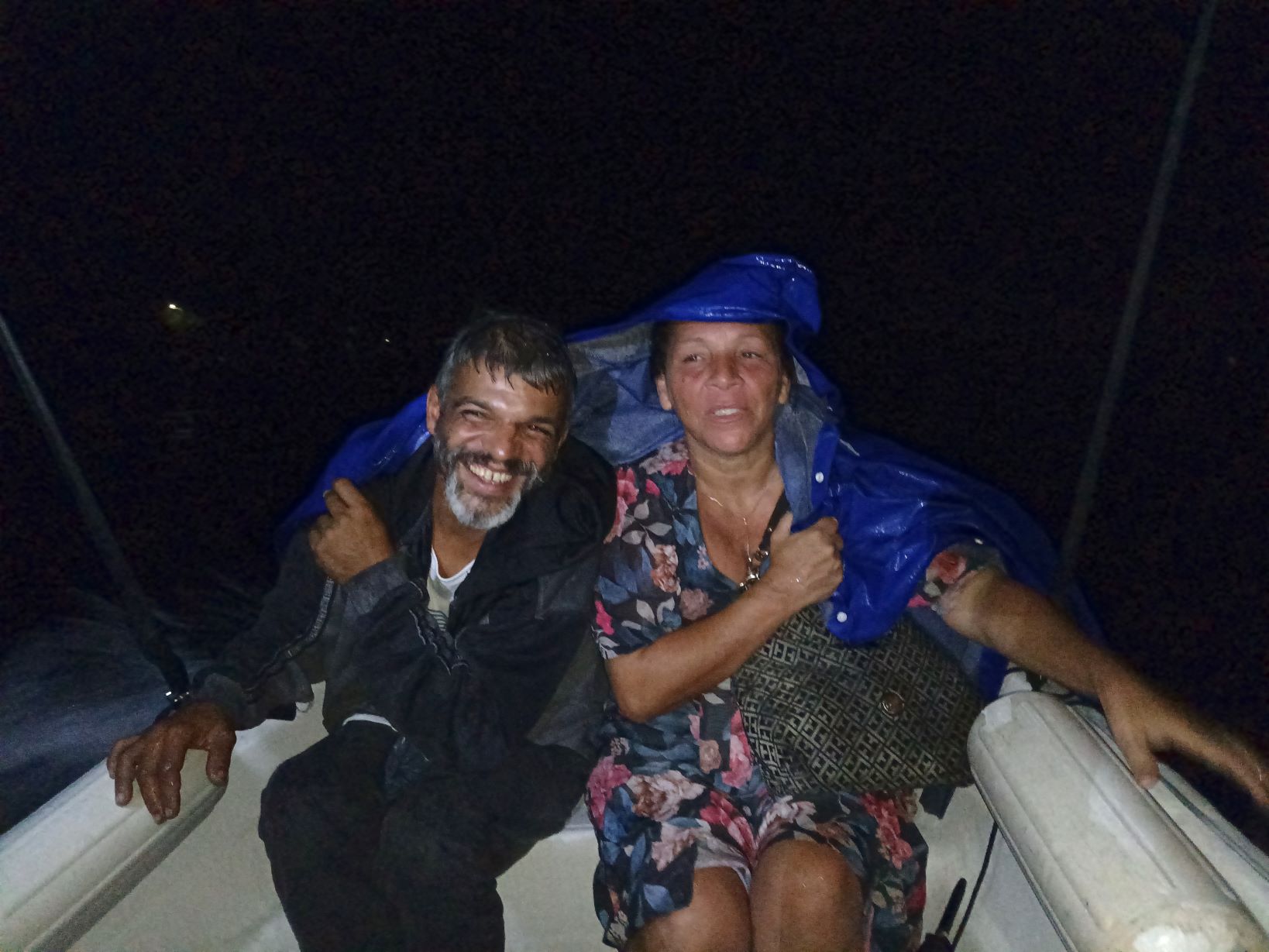 Terwijl we naar het haventje reden om met een motorboot opgepikt te worden, begon het opnieuw te hozen. Opnieuw leek de afspraak in het water te vallen. Maar we zeiden dat niets ons nu zou tegenhouden om naar het eiland te gaan, omdat er personen gered, bevrijd en genezen moesten worden. Patricia een studente van onze trainingsschool sloot zich bij ons aan. Gewapend met een lekkende paraplu en poncho’s stapten we in de motorboot en voeren in het donker naar het eiland.